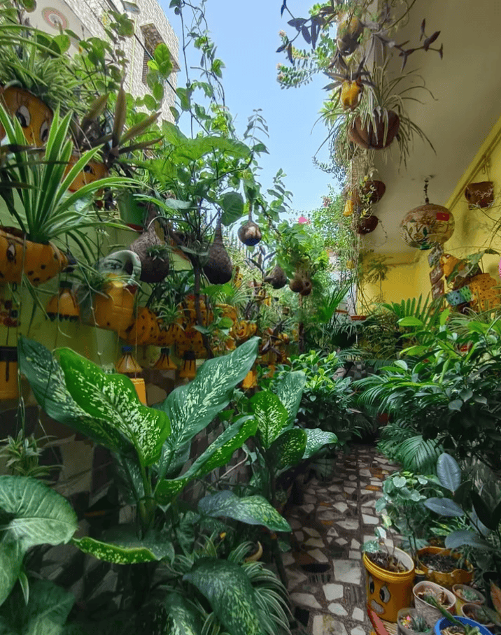 This garden suits plant lovers who enjoy tending many varieties in one compact area. It turns an ordinary corridor balcony into a breezy, shaded jungle that stays cool on hot afternoons.