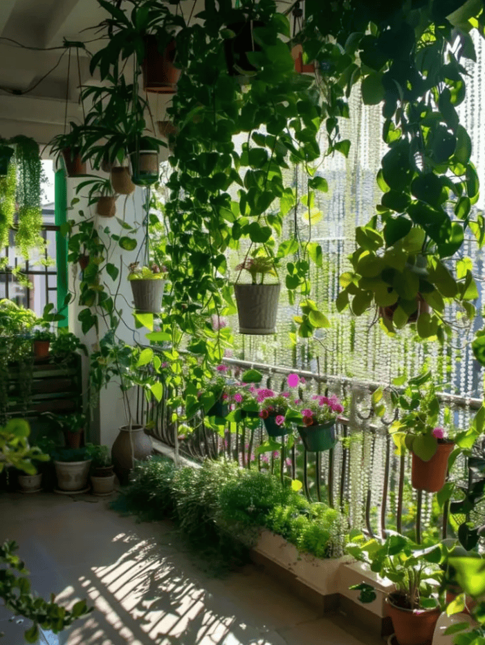 This balcony garden creates a living curtain of green that filters sunlight and frames the view. Trailing pothos and philodendron hang from the ceiling, their vines cascading toward the tiled floor.