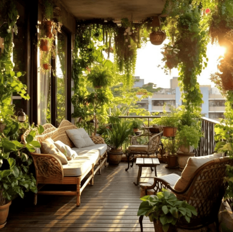 This balcony garden feels like an outdoor living room wrapped in cascading plants.