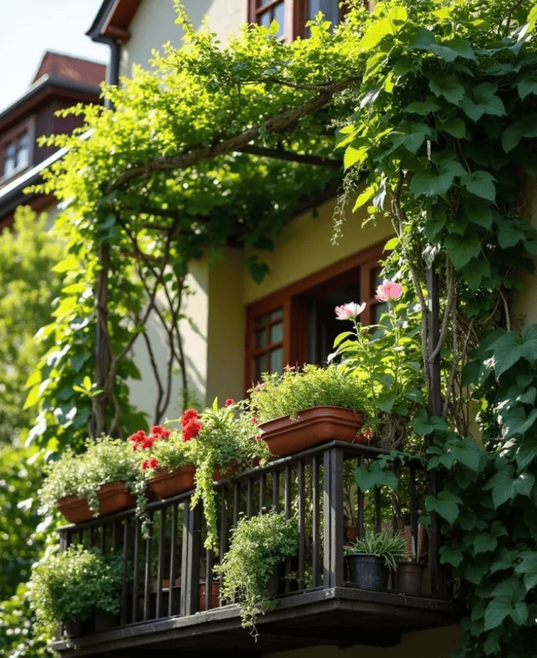 Pots of herbs and trailing plants perch on the balcony floor, filling gaps with texture.