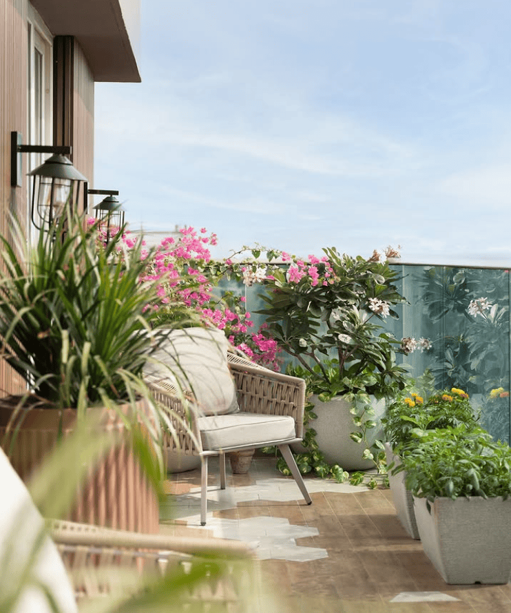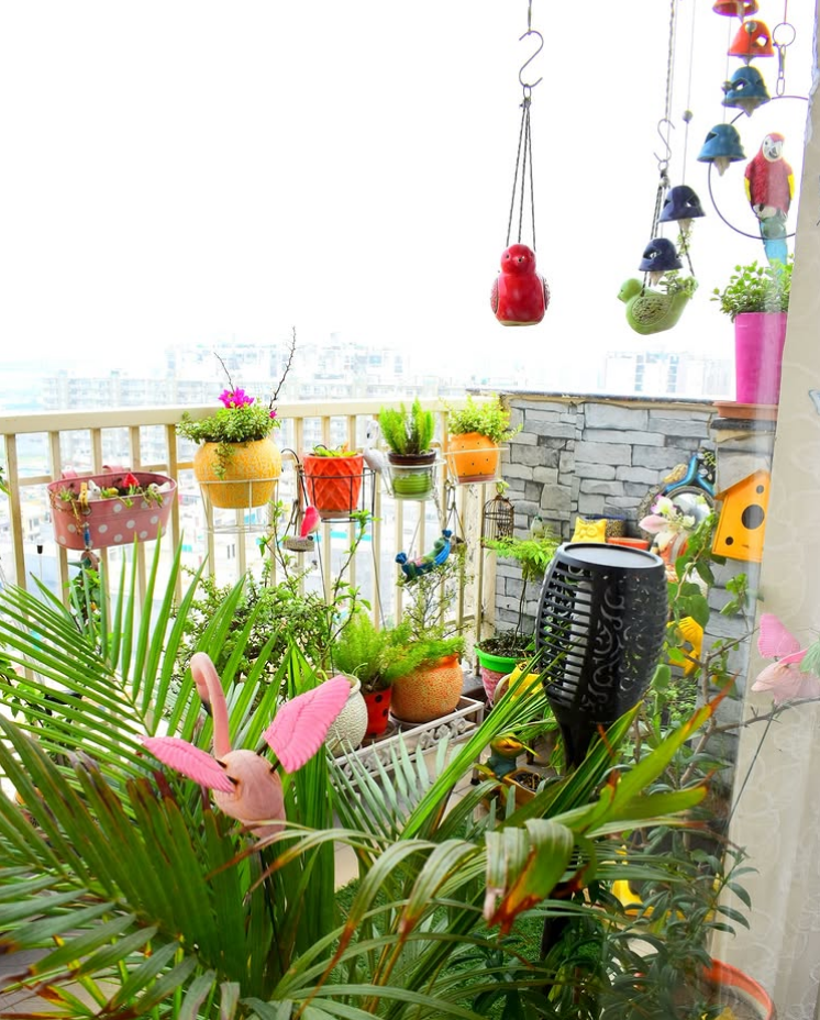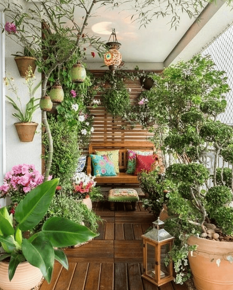 Colorful Balcony Garden With Seating Corner