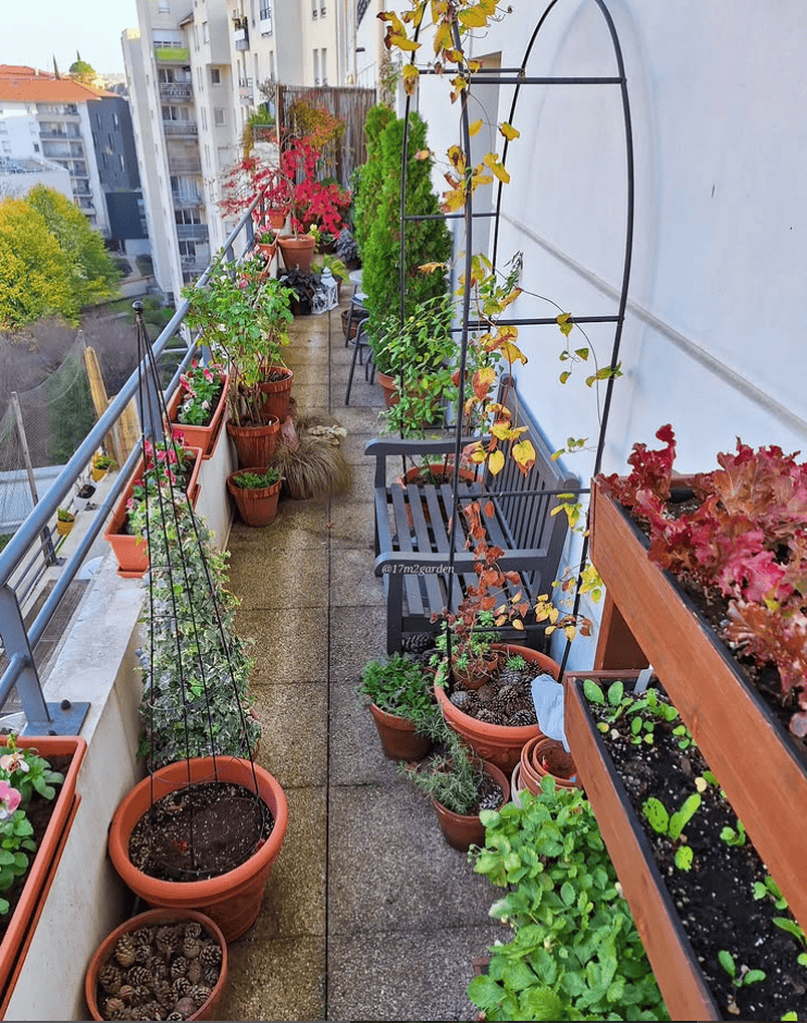 It is an inspiring idea if you want productive balcony gardening with structure, privacy, and an inviting spot to sit among your crops.