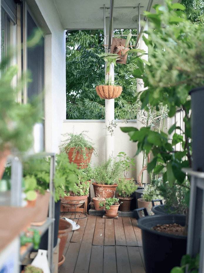 This balcony suits gardeners who love tending many small plants.