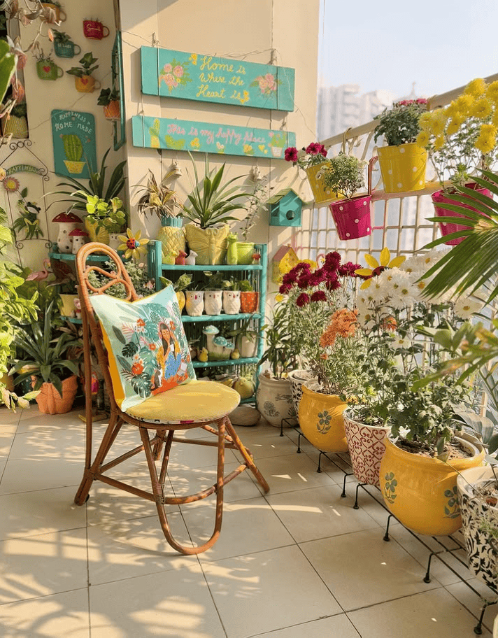 This balcony garden is all about joy and color. A rattan chair with a bright printed cushion anchors a tiny seating corner, surrounded by layers of plants in sunny yellow, turquoise, and patterned pots.