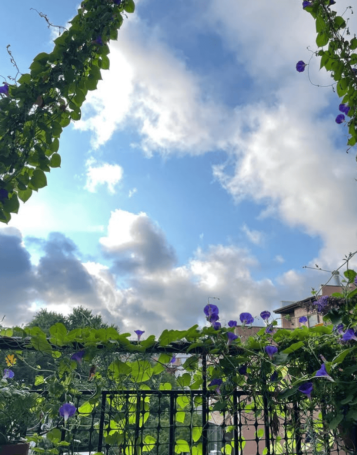 This balcony garden turns simple railings into a living frame for sky and clouds.