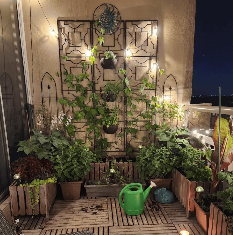 This balcony garden glows softly at night, thanks to string lights woven across a decorative metal trellis. The trellis anchors the entire design, supporting climbing vines and several wall-mounted planters.