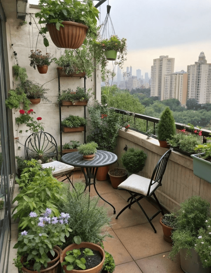 This balcony garden feels like a tiny outdoor living room wrapped in greenery.