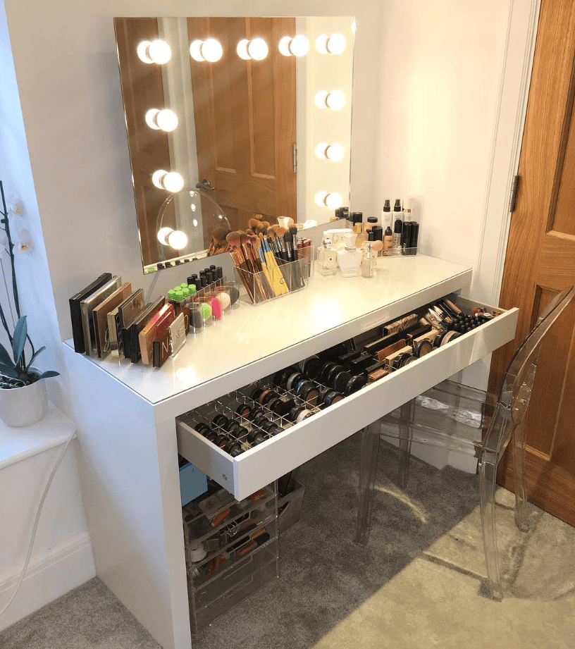 Storage is key to keeping your vanity area neat and inspiring. If you own a large collection of beauty products or accessories, opt for a table with drawers, cabinets, or built-in organizers.