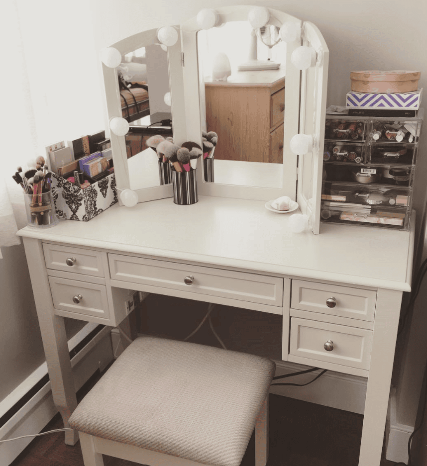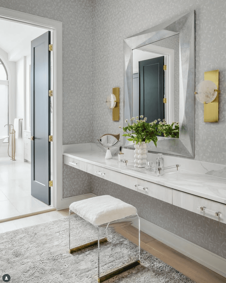 If you have the space, turn your dressing area into a statement zone. A full-size vanity with side cabinets, multiple drawers, or a wide countertop gives you room to spread out and display your favorite pieces.