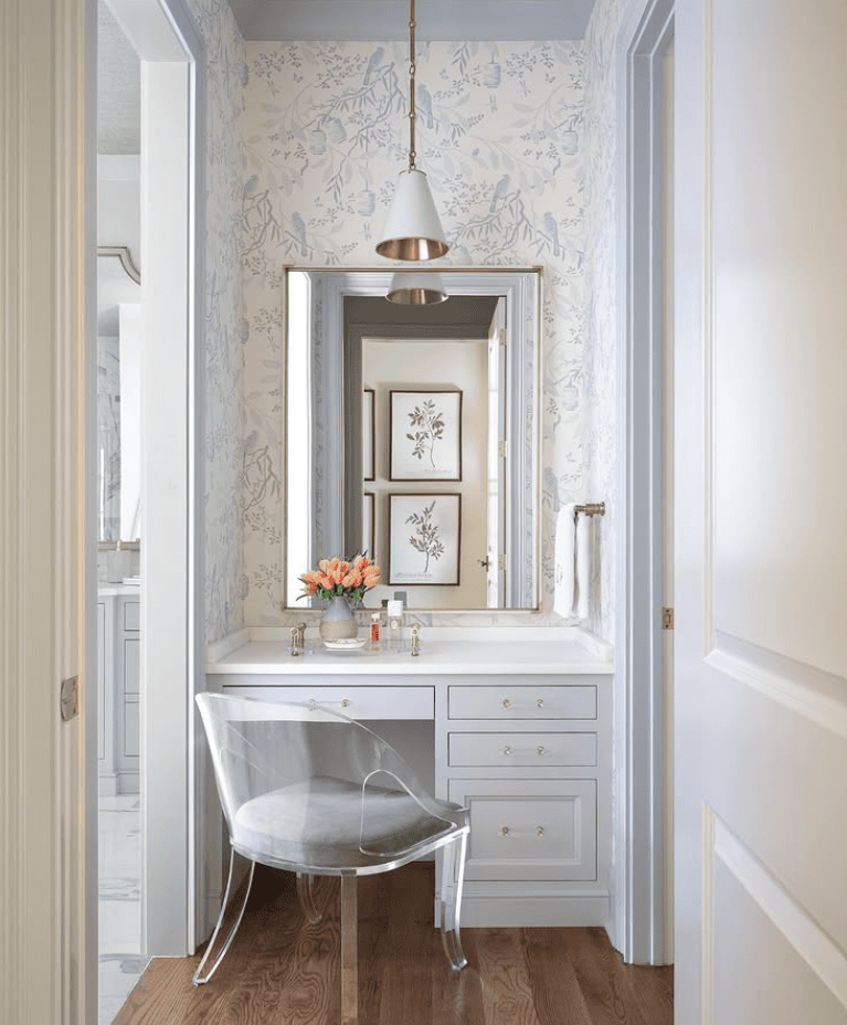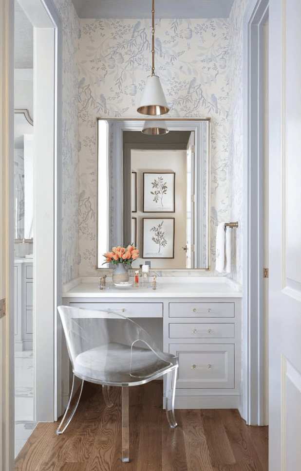 When space is tight, every inch matters. Opt for a floating or wall-mounted vanity that keeps the floor clear and visually light. A narrow console table with drawers can double as both a desk and a dressing station.