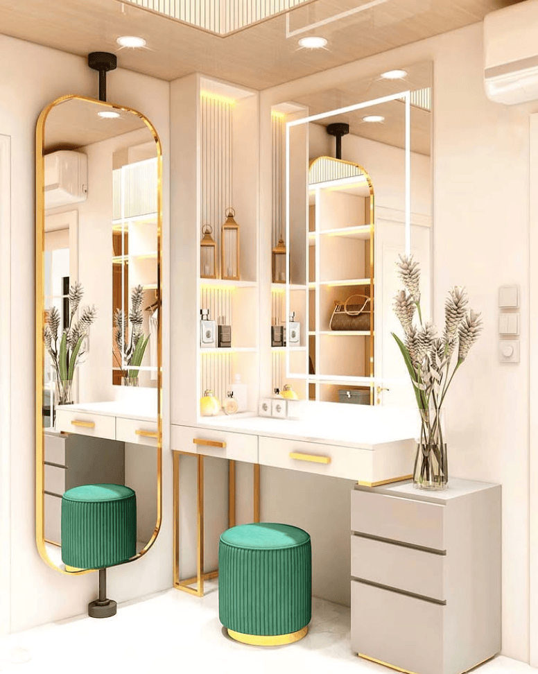 Keep the color palette cohesive with tones of ivory, blush, or champagne accented by gold or brass hardware. A glam dressing table should feel indulgent yet polished, the perfect setting for your daily self-care ritual.