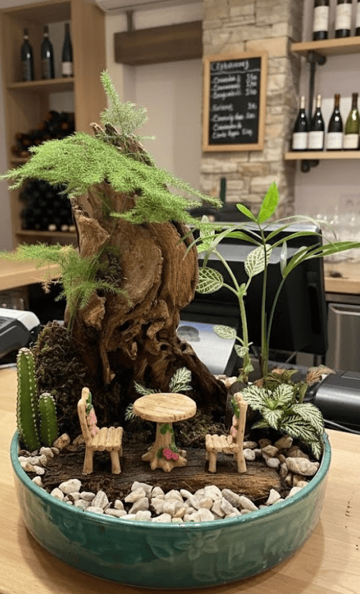 Faux greenery also suits children’s fairy gardens indoors.