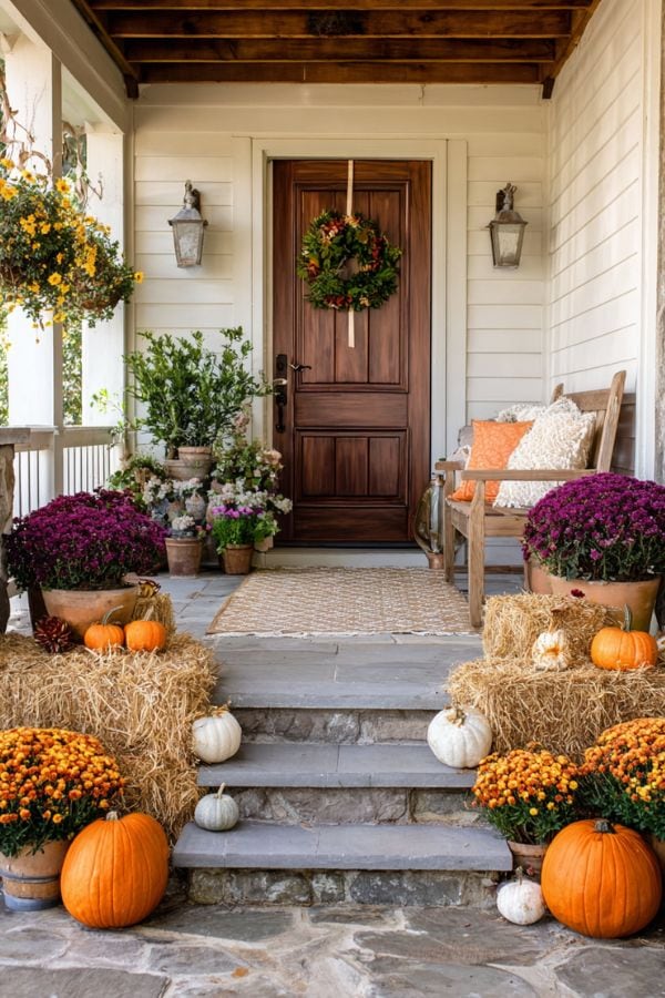 Layer large pots with mums, ornamental kale, and trailing ivy. Mix heights and colors to create a lush, full look at your doorstep.