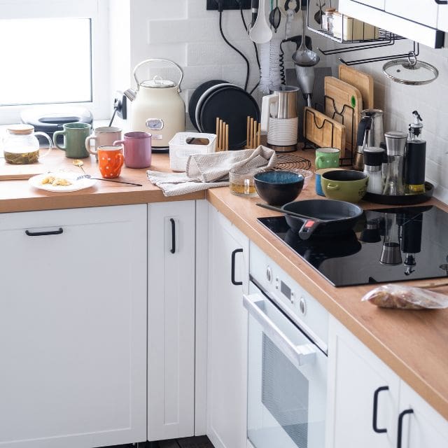Clear space is part of the design. Empty counter areas make small kitchens feel larger and more intentional. If something does not get used daily or does not make the space calmer, it does not belong on the counter.
