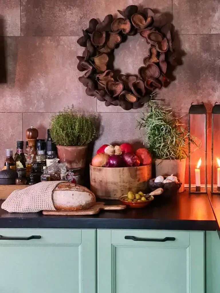 Keep the counter mostly clear and let the season show through one focal point. That way, it still feels like a kitchen, not a display.