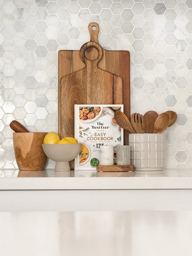 Use wood where it makes sense, near prep areas or the stove. Keep the rest of the counter clear so the wood reads as a styling moment, not clutter. This simple layer adds depth without taking up working space.