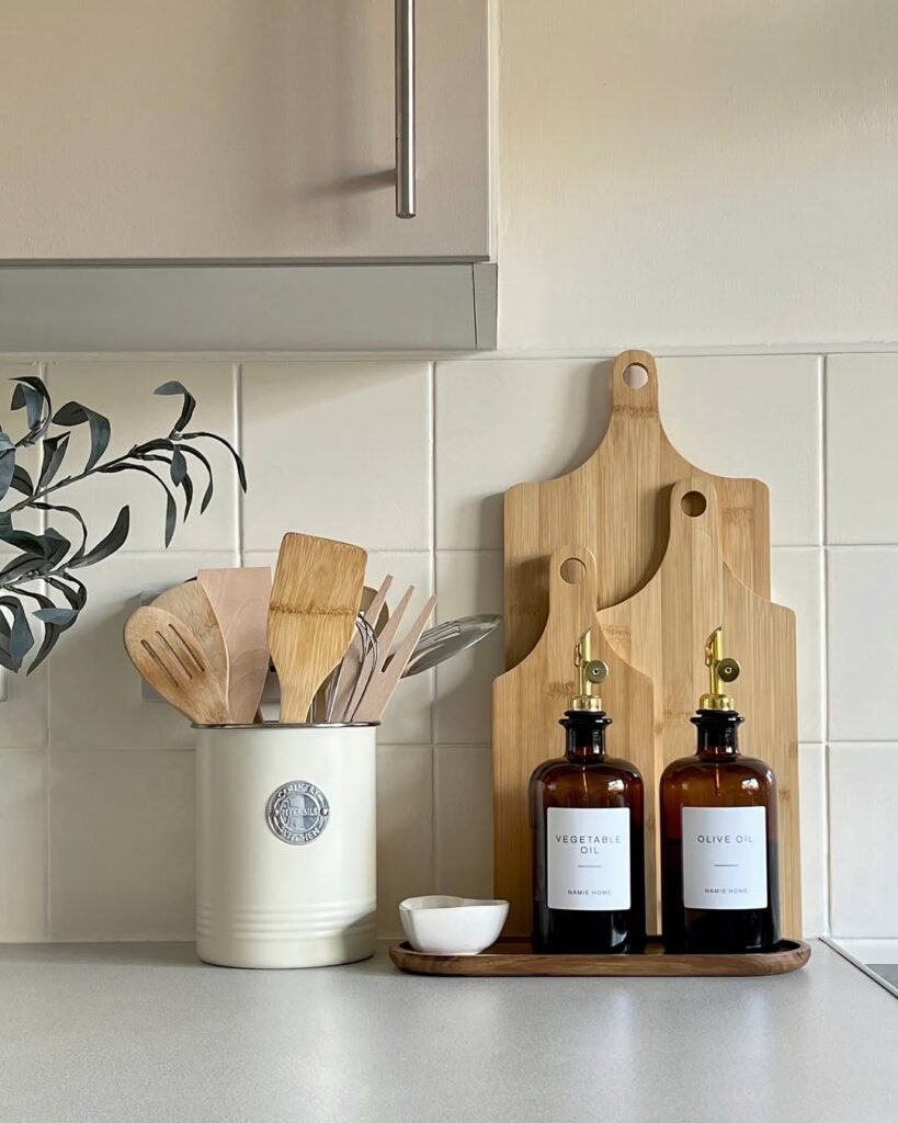 If you want a decorative touch, lean one cutting board against the backsplash or use a small tray to contain the essentials. Choose heat-safe materials like ceramic, metal, or stone. When this zone is organized and functional, it looks intentional and makes cooking easier.