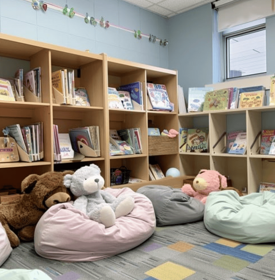 Designed for children, this fun and welcoming nook uses warm wood shelving and colorful beanbags to encourage hours of reading. The soft pastel tones of the walls and carpet squares create a cheerful atmosphere, while low bookshelves keep stories easily accessible. The oversized stuffed animals add coziness and fun, making the nook feel safe and engaging.
