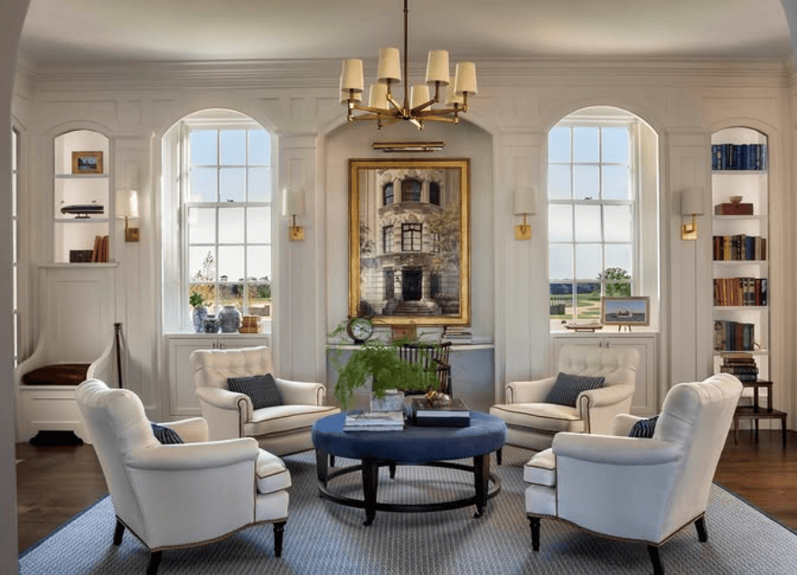 This refined library-style nook balances classic architecture with soft comfort. White paneling, arched shelving, and large windows create symmetry and grace. Four tufted cream chairs encircle a navy ottoman, forming a conversational yet serene layout. Brass wall sconces and a chandelier provide layered lighting, while a large framed artwork anchors the room with timeless sophistication.