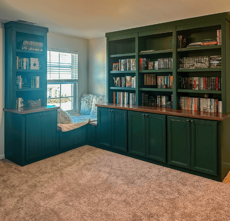This timeless design features deep green built-in cabinetry that exudes warmth and sophistication. The natural wood countertop and trim complement the moody tones beautifully, while the soft carpet adds texture and coziness. A window seat tucked into the corner provides the perfect reading spot, surrounded by books and soft natural light.