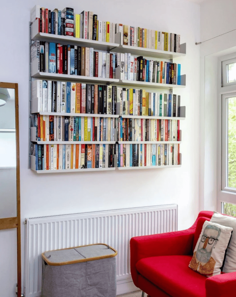 This cozy nook proves that bold color can still feel inviting. The red armchair serves as a vibrant statement against the crisp white walls, making it the heart of this simple setup. Floating metal bookshelves above the radiator create a modern library wall while keeping the floor clear. A playful cushion and nearby natural light soften the look, balancing energy with comfort.