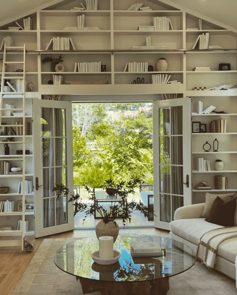 This stunning reading nook bridges indoor calm with outdoor serenity. A vaulted ceiling with symmetrical built-in shelves draws the eye upward, while white finishes reflect light and keep the room feeling spacious. The French doors open to a lush garden, blurring boundaries between nature and home. A low, organic wood coffee table and sculptural glass accents add earthy warmth against the minimalist backdrop.