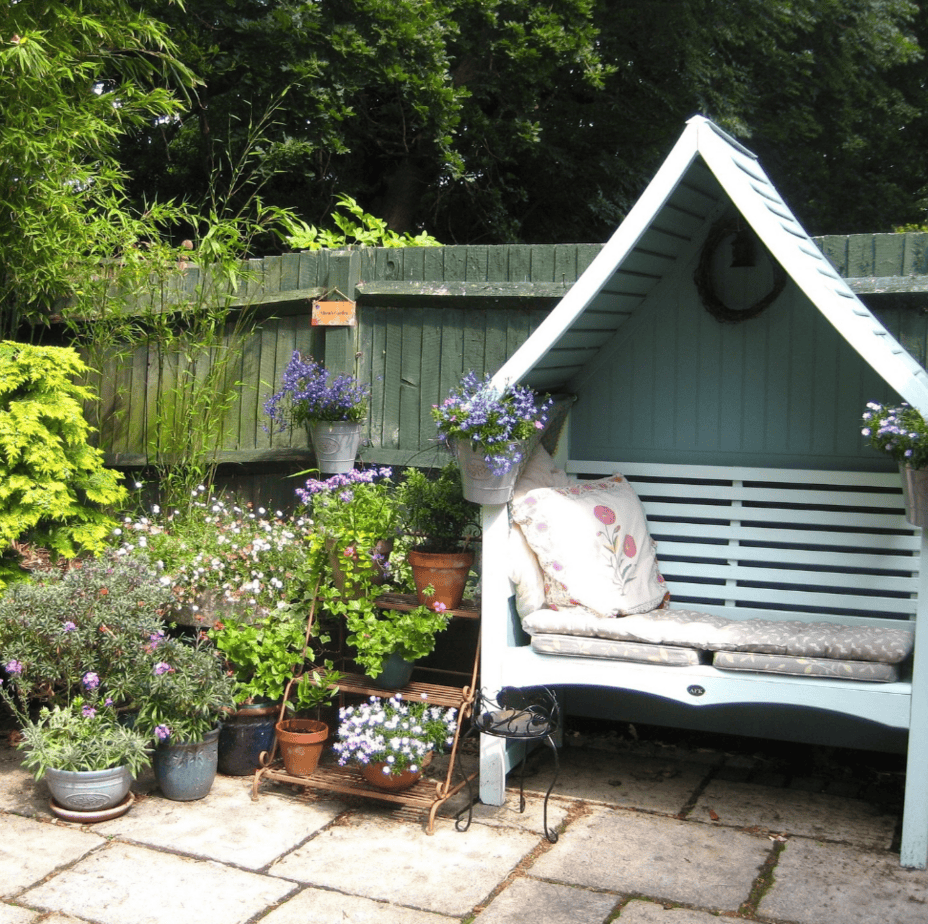 This enchanting outdoor nook brings cottage charm to life. A small arched bench painted in pastel blue sits nestled among potted flowers and trailing greenery, creating a peaceful garden hideaway. The patterned seat cushion and floral pillow soften the look, while hanging planters frame the structure beautifully. It’s a quiet spot to sip tea, enjoy a book, or simply listen to birdsong.