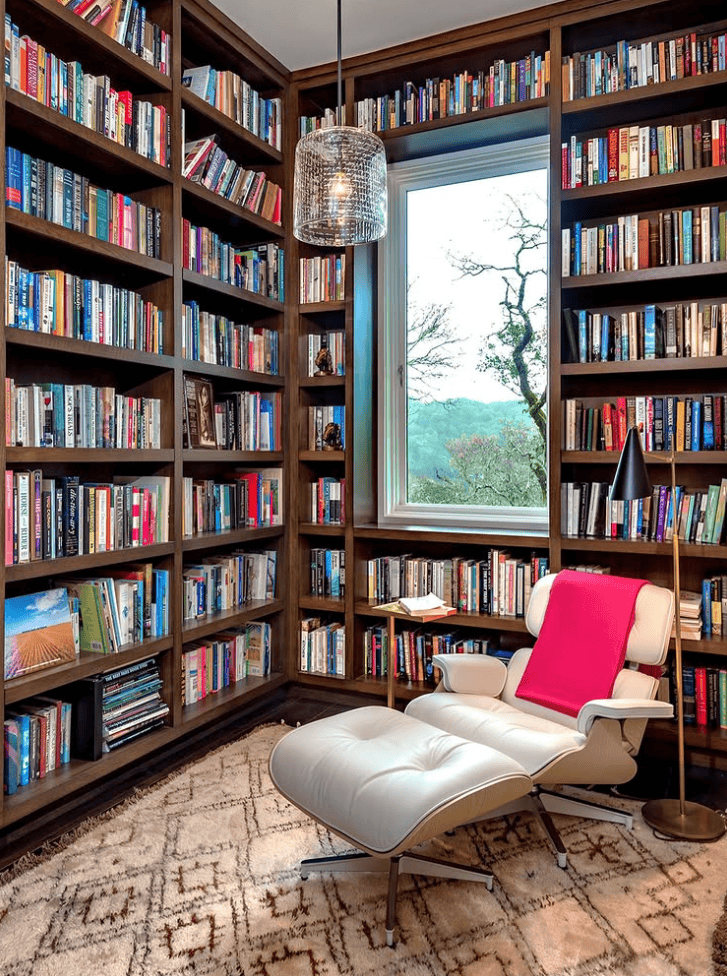 An elegant retreat for serious readers, this floor-to-ceiling library nook combines rich wooden shelves with a classic Eames-style lounger for timeless comfort. The large window floods the room with natural light, while layered books and sculptural lighting keep the space both functional and stylish. The cream leather chair paired with a magenta throw adds modern sophistication to the cozy, carpeted setting.