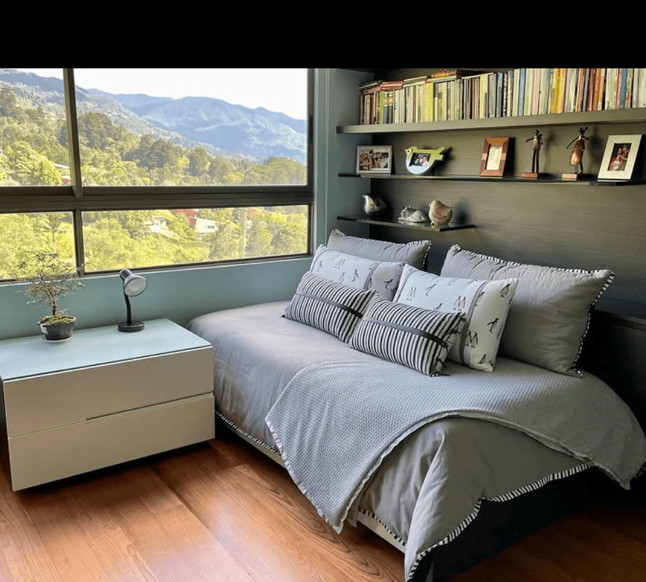 This modern bedroom nook makes the most of breathtaking mountain views. A daybed dressed in soft gray bedding sits beneath a wide window, creating a serene and minimalist space for reading or napping. The sleek floating shelf doubles as both decor display and a mini library, while the streamlined side table and bonsai plant add subtle balance.