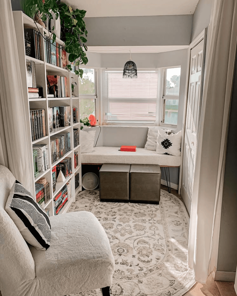 Even the smallest apartment can have a reading nook with the right creativity. Try converting a closet into a mini reading space, adding floating shelves above a cozy chair, or styling a corner of the bedroom with a soft throw, pouf, and wall-mounted lamp.