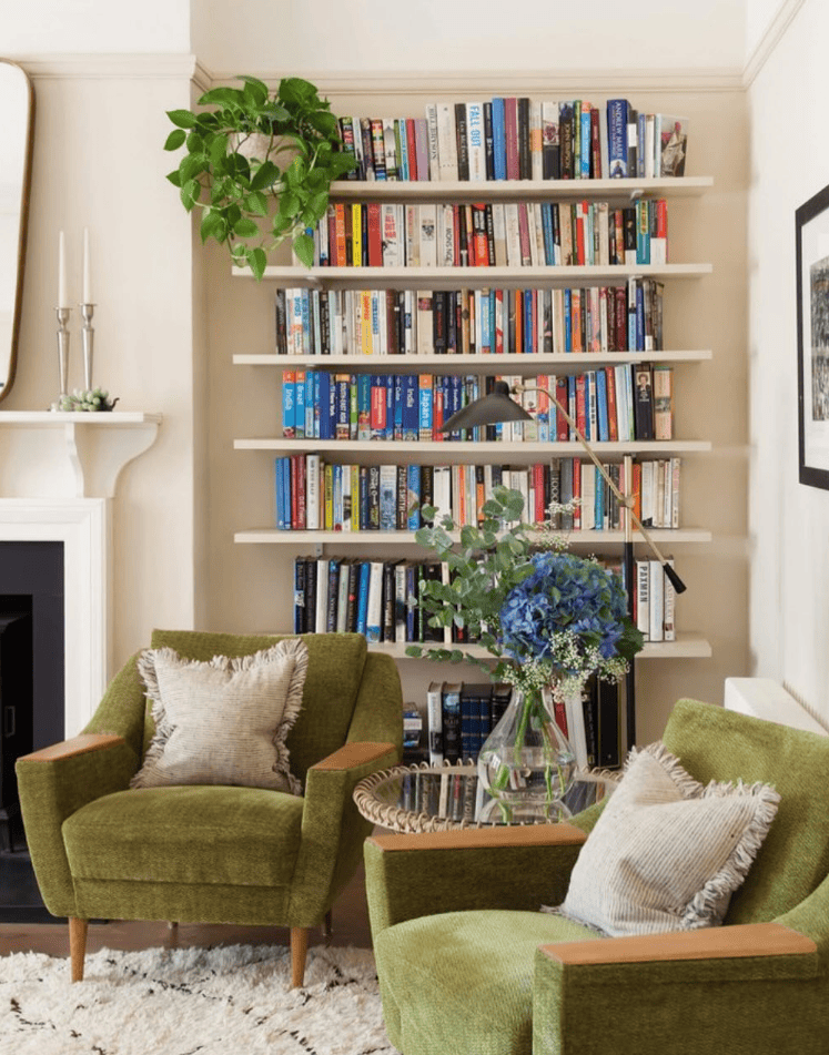 This chic nook merges mid-century lines with retro flair. Olive-green armchairs bring a bold pop of color, perfectly complemented by a neutral rug and warm wood shelving filled with colorful spines. The gold reading lamp and glass vase add a polished touch, while the layered textures – velvet, linen, and wood – create depth and coziness. A small round side table ties everything together without overwhelming the layout.