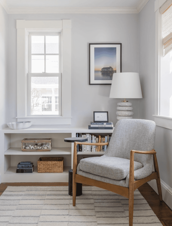 This minimalist reading nook embraces simplicity and light. The soft gray walls and clean white trim create a calm, airy atmosphere. A mid-century-inspired armchair with light wood arms adds warmth, while built-in shelving provides subtle storage for books and baskets. The white lamp with sculptural texture brings balance and soft illumination, perfect for late-afternoon reading. A striped area rug grounds the space, tying in the neutral palette.