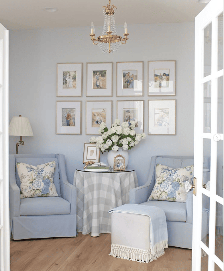This elegant nook blends classic comfort with timeless charm. Pale blue walls set a serene backdrop for two skirted armchairs with floral cushions, a checkered round table, and a fringed ottoman. A gold chandelier adds a soft glow, while a gallery wall of framed family photos makes the space deeply personal. The floral arrangement and soft plaid textures evoke a touch of Southern cottage style, creating a spot that feels both graceful and lived-in.